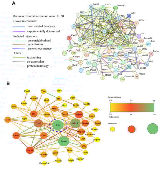 The protein–protein interaction (PPI) network visualizes the DEGs’ mutual relationship. PPI network analysis has been used to predict and identify core targets in disease pathogenesis. Based on the above data, a PPI network was mapped on the STRING website and further analyzed using Cytoscape software. The STRING database displayed the DEG association network (Figure 7A). Then, the PPI network was uploaded into the Cytoscape software for visualization. A total of 44 DEGs with 109 edges formed the PPI network among genes affected by SA (Figure 7B), manifesting that the regulation of these genes could be responsible for the beneficial action of SA on LPS-induced ALI. The interaction results of the DEGs are showed according to combined score, and the degrees of DEG interaction are displayed by each node’s color. It is clear that IL-1β, ITGAM, NF-κB2, CXCL1, ICAM1, synuclein, alpha interacting protein (SNCAIP), C-X-C motif chemokine receptor 2 (CXCR2), and MAP3K8 were among the proteins interacted with the most. Proteins such as IL-1β, MAP3K8, NF-κB2, CXCL1, ICAM1, GLUL, and ubiquitously transcribed tetratricopeptide repeat containing, Y-linked (UTY) have been reported to be associated with inflammation and diseases [19,26,27]. These genes were also closely related to inflammation and the MAPK-NF-κB signaling pathway, which has been proven to be a vital anti-inflammatory target [28]. It also can be seen that, apparently, IL-1β occupied the core position in the PPI network. This means SA could have an anti-inflammatory ability on LPS-induced ALI through modifying the MAPK-NF-κB pathway.