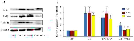 Inflammation generally is interrelated with dysregulated inflammatory cytokines. Cytokines like IL-6, IL-1β, and TNF-α are pro-inflammatory genes, and their levels and inflammation present a positive correlation [29]. To further verify the molecular mechanism of SA in the mitigation of ALI, related protein expressions were validated by WB analysis. Compared with the CON group, the protein levels of IL-6, IL-1β, and TNF-α were distinctly raised 3.87, 3.95, and 3.53 fold, respectively, compared with the LPS-treated group (p < 0.01). It is notable that SA supplementation especially blocked the generations of these inflammatory factors in a dose-dependent relation. The expressions of IL-6, IL-1β, and TNF-α were strikingly reduced by 52.20%, 73.42%, and 65.16% after 100 mg/kg SA supplementation (Figure 8A,B). As stated above, the protective effect of SA on LPS-induced mice may have contributed to its anti-inflammatory effect.