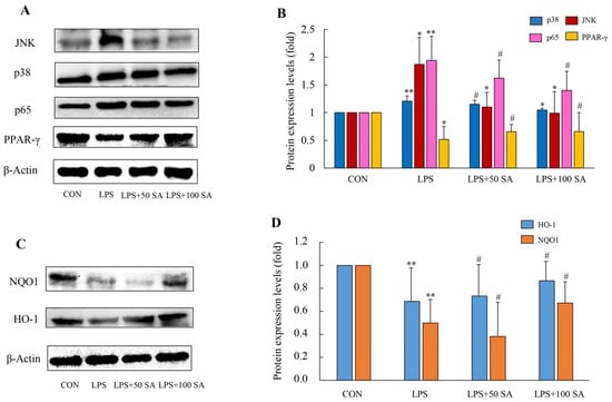 Effects of SA supplementation on the JNK/p38/PPAR-γ-NF-κB pathway and the expressions of the oxidation-related genes of the lung tissues. The protein expressions of JNK, p38, NF-κB, and PPAR-γ were tested by western blot analysis (A,B). Effects of SA supplementation on the protein levels of oxidation-related genes (HO-1 and NQO1) (C,D). CON: control; LPS: lipopolysaccharide; LPS + 50 SA: LPS + 50 mg/kg/day SA; LPS + 100 SA: LPS + 100 mg/kg/day SA; SA: sialic acid. The data are expressed as mean ± SD. CON group vs. LPS group or LPS group vs. LPS + 50 SA group and LPS + 100 SA group. * p < 0.05. ** p < 0.01. # p > 0.05.