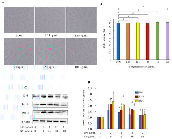 To explore the anti-inflammation of SA in vitro, the expressions of inflammation-related markers in HUVEC cells were estimated. WB analysis showed that the expressions of IL-6, IL-1β, and TNF-α were dramatically increased in the LPS group compared with the CON group. The relative contents of these pro-inflammatory markers in the LPS-treated group elevated 1.62, 2.09, and 2.35 fold (Figure 10C,D). SA decreased the protein levels of IL-6, IL-1β, and TNF-α in LPS-stimulated HUVEC cells in a dose–effect relation; the 100 μg/mL SA treatment effectively reduced them by 27.78%, 42.11%, and 47.23%, respectively. The decline in inflammatory molecule expression was indicative of the anti-inflammatory activity of SA. These results were in accord with the in vivo research. All of these data demonstrated that SA mitigated inflammation through repressing the pro-inflammatory cytokines’ expression.