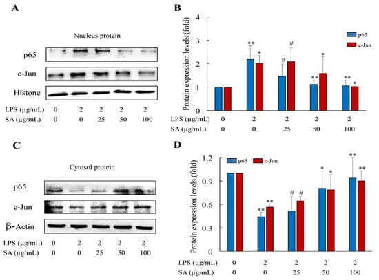 NF-κB and AP-1 are two essential transcriptional regulators of pro-inflammatory molecules mediating the inflammatory process [35]. Therefore, to detect whether the activations of NF-κB and AP-1 were restrained by SA in LPS-induced HUVEC cells, the contents of transcriptional regulators p65 and c-Jun in cytoplasmic and nuclear extracts were examined by WB analysis. The results showed that stimulation with LPS increased the relative expressions of p65 and c-Jun in the cells’ nuclear proteins, and fewer p65 and c-Jun activities in the cell cytoplasmic proteins occurred, manifesting that the stimulation of LPS profoundly increased the nuclear translocations of p65 and c-Jun (Figure 11). However, SA pretreatment greatly reversed p65 and AP-1 translocations in the HUVEC cells. Consistent with the results of inflammatory factor expression, the downregulation of NF-κB and AP-1 transcriptional activations led to a decrease in pro-inflammatory factor production. Collectively, the prevention of NF-κB and AP-1 activities may be correlated with the anti-inflammatory property of SA.