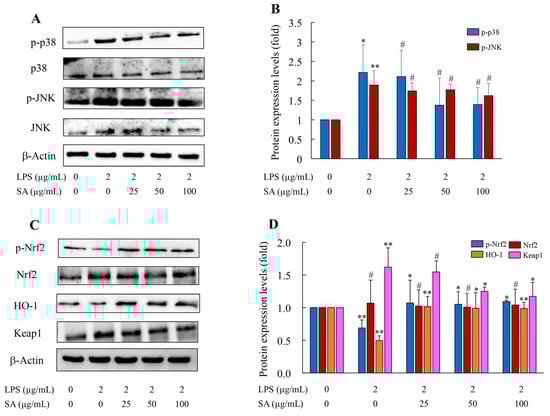 SA (purity: 99%, white powder) was bought from Chengdu Push Biotechnology Co., Ltd. (Chengdu, China). SA was dissolved in distilled water, and various concentrations of SA solutions were homogenized with a turbine mixer for 2 min. LPS was ordered from Sigma Aldrich Co., Ltd. (Shanghai, China). RPMI-1640 medium was obtained from Gibco BRL (Carlsbad, CA, USA). Fetal bovine serum (FBS) was provided from Inner Mongolia Opcel Biotechnology Co., Ltd. (Hohhot, China) A radioimmunoprecipitation assay (RIPA) buffer solution was purchased from Servicebio Co., Ltd. (Wuhan, China). Nuclear and cytoplasmic protein extraction kit was obtained from Beyotime Biotechnology (Shanghai, China). A PrimeScript™ RT kit was brought from the Takara Company (Takara, Shiga, Japan). Polyclonal antibody tumor necrosis factor-α (TNF-α, CAT. #6945S), interleukin-6 (IL-6, CAT. #12912S), interleukin-1β (IL-1β, CAT. #12242S), nuclear factor kappa-light-chain-enhancer of activated B cells (NF-κB) p65 (CAT. #12629S), activator protein 1 (AP-1, CAT. #9165S), and mitogen-activated protein kinase (MAPK) family antibody (JNK, CAT. #9252S; p-JNK, CAT. #4668S; p38, CAT. #9212S; p-p38, CAT. #4511S) were provided by Cell Signaling Technology (Danver, MA, USA). Nuclear factor erythroid 2 related factor 2 (Nrf2, CAT. #66504-1-lg), Kelch-like ECH-associated protein 1 (Keap1, CAT. #60027-1-lg), NADH quinone oxidoreductase 1 (NQO1, CAT. #67240-1-lg), and heme oxygenase-1 (HO-1, CAT. #67643-1-lg) antibody were obtained from Proteintech Company (Chicago, IL, USA). β-Actin, anti-mouse IgG Horseradish Peroxidase (HRP) conjugate, and anti-rabbit IgG HRP conjugate were obtained from Promega Corporation (Madison, WI, USA). Other chemical reagents used in this investigation were of analytical grade.