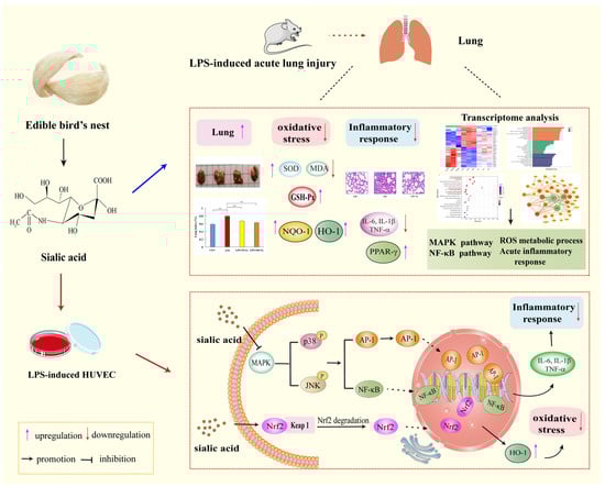 ALI is a serious pulmonary disease which is interrelated with ARDS. Due to its high mortality and morbidity, more attention has been paid to the prevention of ALI in recent years [3,39]. As a typical nutrient component of EBN, SA is reported to have multiple biological functions contributing to health benefits [17,40,41]. Our previous study confirmed its beneficial effect on ulcerative colitis [19]. However, there have been no investigations which linked SA actions to ALI. In this research, a systems analysis approach was performed to explore the protective function and correlated underlying mechanism of SA in ALI (Figure 13). SA supplementation could attenuate LPS-induced lung injury in mice through inhibiting inflammation and oxidative stress. In parallel, the regulation of SA treatment in LPS-treated HUVEC cells was examined, which verified its better anti-inflammatory and antioxidative abilities by modulating the JNK/p38-NF-κB/AP-1 and Nrf2 signaling pathways. This was the first time the beneficial effect of SA in the prevention of ALI was investigated.