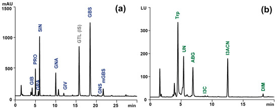 Sample chromatogram of (a) desulfoglucosinolates (λ = 229 nm) obtained during LC-PDA analysis and (b) indolic compounds (ex./em. −280/360 nm) obtained during LC-FLD analysis of extract from raw Brussels sprouts. GIB, glucoiberin; PRO, progoitrin; GRA, glucoraphanin; SIN, sinigrin; GNA, gluconapin; GIV, glucoiberverin; GTL (IS), glucotropaeolin (internal standard); GBS, glucobrassicin; GNS, gluconasturcin, metGBS, methoxyglucobrassicin; Trp, tryptophan; UN, unknown; ABG, ascorbigen; I3C, indole-3-carbinol; I3ACN, 3-indoleacetonitrile; DIM, diindolylmethane.