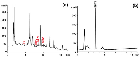Sample chromatograms obtained during determination of (a) individual ITC as ITC-NAC conjugates (λ = 272 nm) and (b) total ITC as BDTT (λ = 365 nm) of extract from raw Brussels sprouts. IB, iberin; AITC, allyl-ITC; SFN, sulforaphane; BITC, 3-butenyl-ITC; BDTT, 1, 3-benzenedithiole-2-thione.