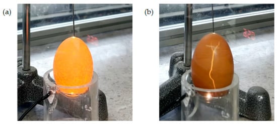 Since eggshell is mostly composed of calcium carbonate, which can be a good candidate for high-power insulation, several studies have been conducted to develop new polymeric insulation using eggshells []. The eggshell containing a tiny pore has high electrical resistivity under the atmospheric condition; however, the other whole egg components, such as the yolk, albumen, and membrane, can be considered dielectrics because their molecules are partially aligned with the applied external electric field []. The eggshell membrane exposed by a crack may be more electrically conductive than the eggshell. Therefore, it was hypothesized that the electric discharge would only be observed at the crack in the eggshell when the egg was placed between high electric fields. As shown in Figure 1a, when the sound eggshell was located between the non-uniform high electric field, the electric discharge was observed all over the surface of the eggshell. On the other hand, the electric discharge was observed at only one crack in the eggshell (Figure 1b), and the trace of electrical discharge appeared in the crack.
