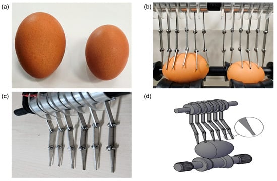 Eggs are not perfect ellipsoids or spheres and vary slightly in size and shape []. Previous studies reported that the thickness of medium, large, extra-large, and jumbo eggs was approximately 0.40 ± 0.02 mm with geometric mean diameters of 44.77 ± 0.59 mm, 46.66 ± 0.62 mm, 48.36 ± 0.62 mm, and 49.83 ± 0.83 mm, respectively. Figure 2a illustrates the size difference between commercially available jumbo and medium-grade eggs. The electrodes had to be arranged in such a way that a uniform high electric field could be applied to the entire surface of the eggs, even when eggs were randomly inserted regardless of their grade. Based on size data for different egg grades obtained from previous research, a set of six electrode pins was used, with each pin spaced 1 cm apart. As shown in Figure 2b, 5 to 6 pins make contact with jumbo eggs, while 4 to 5 pins make contact with smaller eggs.