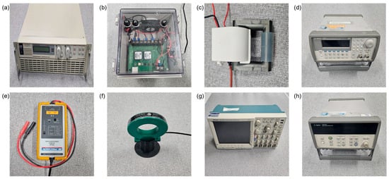 Configuration of power supply and monitoring device: (a) programmable DC power supply; (b) custom IGBT module; (c) high-voltage switching transformer; (d) arbitrary waveform generator; (e) differential probe; (f) broadband current monitor; (g) oscilloscope; (h) data acquisition device.