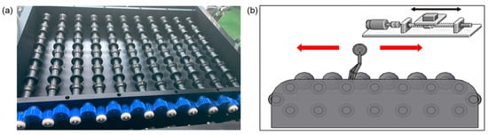 The egg rotation system consisted of a step motor (57HBM100-1000, Leadshine, California, CA, USA) and motor drive (HBS57H, Leadshine, California, CA, USA), a linear actuator module (LSM5-NK173117-0808, Guro, Seoul, Republic of Korea) for moving the detection unit back and forth, and a custom egg rotation roller. The egg rotation roller was designed to ideally contact the egg surface, preventing ejection during rotation due to the non-perfect ellipsoid shape of the eggs. Made of rubber to increase friction and reduce slip, the rollers provided consistent rotation. Despite the tilting phenomenon during rotation due to the non-ellipsoid shape, the elasticity of the rubber prevented breakage. Eleven egg rollers were connected to the step motor. Initially, a fan belt was used to ensure consistent rotation by accurately transmitting the motor’s power, but slip occurred depending on the tension adjustment. This was improved by using gears, as shown in Figure 4a, to ensure consistent rotation across the 11 rollers.