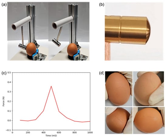 An egg crack striking device was designed and fabricated to obtain the uniform crack in eggshell (Figure 5a). When a flat hammerhead stroked an eggshell, which has a rounded shape, there was a high likelihood of inducing a fracturing effect at the point of contact. Therefore, a hammer with a rounded, striking surface was employed in this study to artificially make the cracks on the surface of eggs. The rounded head allows for the precise application of force at a single point when it comes into contact with the curved surface of the eggshell. The egg was located in the holder and a 100 g impact hammer stroked the surface of the egg. The impacting hammer swing angle was able to be controlled. The impacting force corresponding to the kinetic energy that the egg received was calculated using the following equation []: