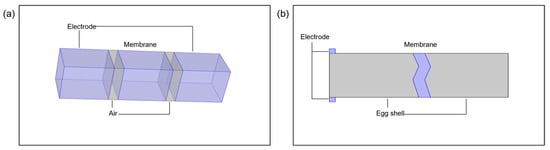 The electromagnetic field and charge density distribution were analyzed in two forms: a static 3D type with an air layer between the electrode and membrane and a dynamic 2D type with the electrode directly contacting the membrane. The boundary conditions of the electromagnetic equations assumed insulation from all external geometries, with an initial temperature T0 = 303.15 K and an initial potential V0 = 0 V. Stainless steel used for the electrodes had a relative permittivity of 1 and an electrical conductivity of 1.45 × 106 S/m, as per the material library. The relative permittivity and electrical conductivity values for the eggshell and membrane were set based on previous studies. The eggshell had a relative permittivity of 15 and an electrical conductivity of 0.5 S/m, while the membrane had a relative permittivity of 3.6 and an electrical conductivity of 1.5 S/m [,]. The air had a relative permittivity of 1 and an electrical conductivity of 0 S/m. During dielectric breakdown, the air layer’s conductivity matched that of the membrane. The computational domain was discretized using tetrahedral mesh to enhance mesh quality. The direct linear system solver (PARDISO) was used to increase convergence rates, with relative and absolute tolerances set to 0.5 each. The simulation geometry is schematically shown in Figure 6.