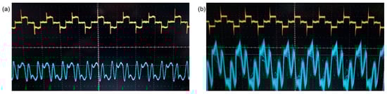 To visually detect sparks more easily, higher voltage and current levels were required. Using higher voltage could facilitate the electrical breakdown of the air layer between the crack and the membrane and was possible to increase the rotation speed and movement of the eggs, thereby enhancing detection speed. However, it also could induce the risk of current fluctuations depending on the crack size, affecting detection accuracy and user safety. Therefore, it was necessary to determine the optimal voltage that could generate visible sparks. It was observed that a voltage exceeding 500 V between the electrode and the crack produced visible sparks. The power supplied to the electrode pins was set to over 500 V at a frequency of 15 kHz. Cracked eggs generated for the experiment were placed among normal eggs and passed through the detection unit. Visible sparks were observed at the cracks. Figure 7a,b show the variations in the supplied voltage and current to normal and cracked eggs. The waveform at the top represents the supplied voltage, while the waveform at the bottom represents the measured current. When 500 V with 15 kHz frequency was applied to normal eggs, the measured average current was 0.65 A; however, in cracked eggs, the current was suddenly increased up to a maximum of 1.5 A.