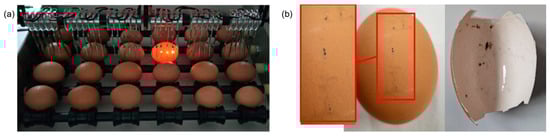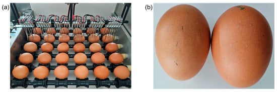 Eggs, which are one of the livestock products in high demand around the world, are an excellent complete food that is not only rich in high quality protein but also contains a variety of nutrients such as vitamins, minerals, and essential amino acids [,]. Since eggs are fragile and prone to external and internal defects, careful attention is required during the sorting, packaging, and distribution processes [,]. The bloody eggs, cracked eggs, and dirty eggs can be considered abnormal eggs []. Dirt and dust on the eggshell can be washed and removed; however, the cracked egg that cannot be restored must be discarded to prevent cross-contamination. If a hairline crack (also known as a “micro-crack”) in the eggshell is not detected during the egg sorting process, this crack can be expanded during distribution []. As a result, foodborne pathogens such as Salmonella can be penetrated through the expanded crack [,]. This poses a significant risk of bacterial contamination and can cause economic losses in the poultry industry [,]. In the past, skilled egg inspectors strived to sort the eggs with defects. This inefficient and subjective inspection could incur the distribution of abnormal eggs to consumers [,].