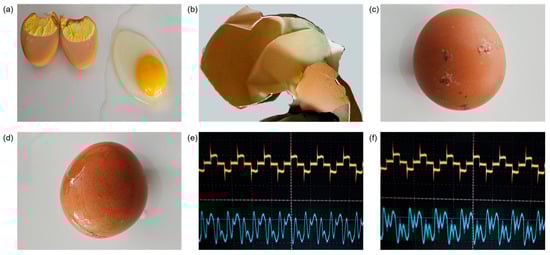Additional experimental scenarios: (a) changes in the properties of the material inside the egg; (b) dried egg membrane; (c) contaminated egg; (d) water-soaked egg; (e) standard power waveform; (f) waveform rippled by moisture.