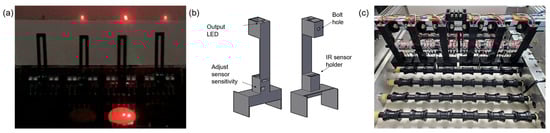To facilitate spark detection from the detection unit, an IR sensor responsive to 760–1100 nm wavelengths was employed. The flame detection system consisted of an Arduino Uno R3, Flame sensor_C57, and an LED bulb. When the detection unit encountered a crack, the spark generated was detected by the sensor and converted into data. Signals exceeding the threshold were used to trigger the LED bulb’s ON/OFF state. If the IR sensor sensitivity was set too high to detect small sparks, it became susceptible to ambient light and sparks from adjacent electrodes, resulting in false positives (Figure 11a). Conversely, lowering the sensitivity reduced false positives but also decreased the accuracy in detecting small sparks.
