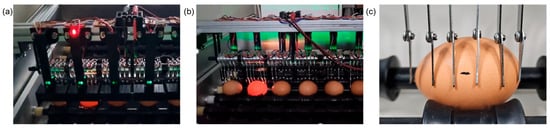 The linear actuator module comprised a linear stage combined with a bipolar motor. The detection unit, with electrode pins, was connected to two linear stages, allowing movement back and forth as illustrated in Figure 4b. While the eggs were continuously rotated by the step motor and egg roller, the detection device with electrode pins was passed over the eggs. Although the electrode pins were placed in the fixed position, the continuous rotation of the eggs on the rollers allowed for the inspection of the entire outer surface of the eggs. By adjusting the rotation ratio of the linear actuator module’s motor and the step motor driving the rollers, the eggs rotated four times while the detection unit passed over them.