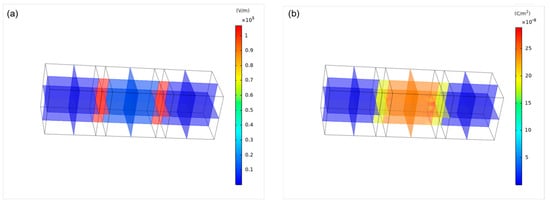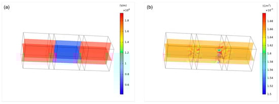 Electric field simulation after dielectric breakdown: (a) electric field distribution; (b) charge density.