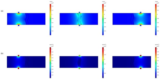 The variation of the electric field as the electrode passed through the membrane was simulated in Figure 15a. The low conductivity of the eggshell prevented electric field distortion until the electrodes contacted the membrane, causing distortion along the membrane, particularly at the bends. Figure 15b shows the charge density, with the highest accumulation at the electrode before membrane contact, followed by a decrease as current flowed through the membrane. If a high-frequency power supply could be configured, the characteristics of the air layer could be ignored. Instead, direct contact between the electrode and the membrane could be assumed, as indicated by the simulation results. This approach eliminated the need for the sequential current flow following charge accumulation and dielectric breakdown of the air layer, as illustrated in Figure 13 and Figure 14.