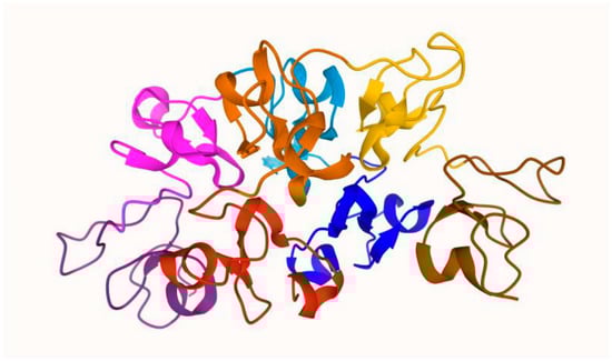 Dimeric structure of the wheat germ agglutinin 3 (WGA isoform n.3) (in Balčiūnaitė-Murzienė et al., 2021 [29]). Red, orange, yellow, and brown colors represent the subunits A, B, C, and D of the first protein, respectively. Blue, light blue, pink, and purple represent the subunits A, B, C, and D of the second protein, respectively. The sugar-binding site is located at the interface of both WGA monomers.