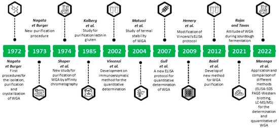 The procedures for the isolation, purification, and crystallization of WGA have been described in the literature since the 1970s. Nagata et Burger published a paper in 1972 [98] that concerned the isolation and crystallization of WGA, as well as its physical and chemical properties. Subsequently, the same authors developed a new purification procedure starting from unprocessed wheat germ [99]. Other studies related to the purification of wheat lectin followed over the years [100,101].
