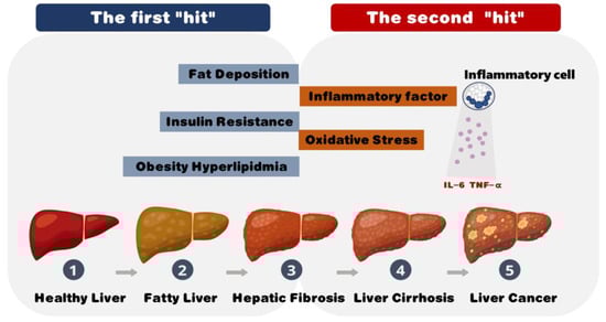 The “Two-hit Hypothesis” of non-alcoholic fatty liver disease. First hit: metabolic disturbances such as obesity, hyperlipidemia, insulin resistance, and fat accumulation lead to liver damage and the development of fatty liver (steatosis); and second hit: inflammatory factors, oxidative stress, and immune cell activation, fueled by cytokines such as IL-6 and TNF-α, exacerbate the damage, advancing the condition to hepatic fibrosis, cirrhosis, and potentially liver cancer. This model underscores the role of metabolic disruptions and inflammation in the progression of NAFLD.