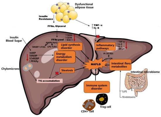 A recent hypothesis emerged to address the shortcomings of the previous two-stage disease progression theory, emphasizing the concurrent and intricate contributions of factors such as insulin resistance, adipokines, bile acids, inflammatory responses, gut microbiota, and other elements in the development of the disease [8,9]. This new perspective particularly highlights the pivotal role of gut microbiota in the progression of NAFLD [5].