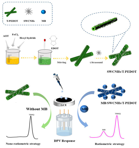 Illustration of the synthesis of SWCNHs/T-PEDOT and the preparation of MB@SWCNHs/T-PEDOT/GCE sensors for TBHQ detection.