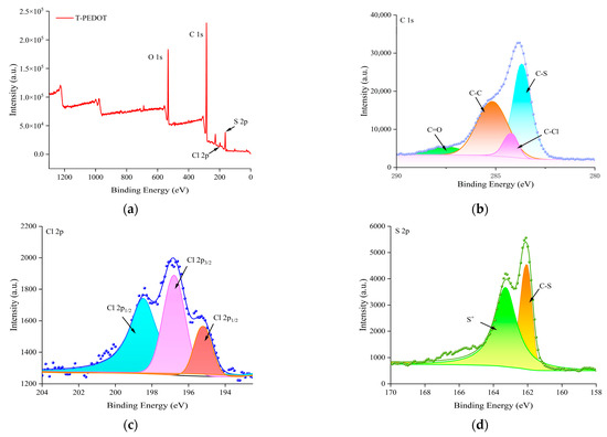 XPS spectra of T-PEDOT: (a) Survey scan; (b) C 1s; (c) Cl 2p; (d) S 2p.