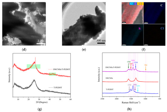 TEM of SWCNHs (a,b); SEM (c) and TEM (d,e) of SWCNHs/T-PEDOT under different magnifications. Mixed energy spectrum of SWCNHs/T-PEDOT and individual energy spectrum of C, S, and Cl (f); XRD of T-PEDOT and SWCNHs/T-PEDOT (g); Raman spectrum of T-PEDOT; SWCNHs and SWCNHs/T-PEDOT (h).
