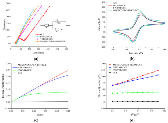 (a,b) EIS and CV of various modified electrodes in 5.0 mmol L−1 [Fe(CN)6]4−/3− (containing 0.1 mol L−1 KCl); (c) Q-t curves of different modified electrodes in 0.1 mol L−1 KCl (containing 1.0 mmol L−1 [Fe(CN)6]4−/3−); (d) The relationship between Q and t1/2.