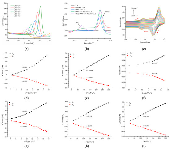 (a) DPVs of SWCNHs/T-PEDOT/GCE under various pH values (2.0–7.0); (b) DPV curves of different modified electrodes in 0.1 mol L−1 PBS (pH 2.0) containing 10.0 μg mL−1 TBHQ; (c) CVs of MB@SWCNHs/T-PEDOT/GCE in 0.1 mol L−1 PBS (pH 2.0) containing 10.0 μg mL−1 TBHQ at different scan rates (20–300 mV s−1). Plot of a linear relationship between TBHQ peak current (Ipa, Ipc) and scan rates (v1/2) (d) and scan rates (v) (e). Plot of a linear relationship between TBHQ peak potential (Epa, Epc) and the natural logarithm of the scanning rate (ln v) (f). Plot of a linear relationship between MB peak current (Ipa, Ipc) and scan rates (v1/2) (g) and scan rates (v) (h). Plot of a linear relationship between MB peak potential (Epa, Epc) and the natural logarithm of the scanning rate (ln v) (i).