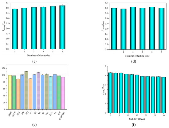 To precisely assess the reproducibility of the ratiometric electrochemical sensing platform, a series of MB@SWCNHs/T-PEDOT/GCE-modified electrodes were meticulously fabricated and employed for TBHQ detection at a constant concentration of 10.0 μg mL−1. The DPV results (ITBHQ/IMB) were determined, as depicted in Figure 6c. The relative standard deviation (RSD) of the six parallel measurements was 2.9% (n = 3), suggesting that the constructed sensor possesses remarkable repeatability. Additionally, the identical MB@SWCNHs/T-PEDOT/GCE was utilized to concurrently determine TBHQ (10.0 μg mL−1) six times, and the calculated RSD was 1.7% (n = 6), indicating good reproducibility in TBHQ quantification (Figure 6d).