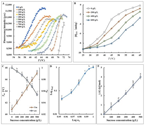 - Miyawaki, O. Hydration state change of proteins upon unfolding in sugar solutions. Biochim. Biophys. Acta Proteins Proteom. 2007, 1774, 928–935. [Google Scholar] [CrossRef]