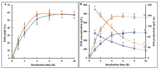 | Process | Incubation Time (h) | Concentration (g/L) and Percentage (%) of FOS Profiles * | |||