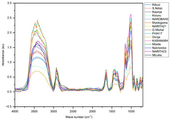 The solubility of the banana RS increased with increase in temperature (Figure 4A). At 90 °C, only NARITA21 had a significantly higher solubility compared to the other cultivars. Regardless of solubility, an increase in the swelling of the granules was observed. However, after 70 °C, there was a reduction in solubility, probably due to the disruption of the granule structure and the leaching of compounds in the granules, according to the Hoover study [46]. For all the banana RS samples, the water absorption capacity, swelling power, and solubility were directly correlated to the increase in temperature. The swelling patterns revealed that, at temperatures below 70 °C, the granules did not significantly swell, which suggested that strong forces acted between the molecules, which maintained the structural integrity of the granules. Studies by Bello-Pérez et al. [44] demonstrate how the granules inflated rapidly at temperatures above 70 °C due to the breakage of the intermolecular hydrogen bonds in amorphous portions, allowing irreversible and progressive water absorption. A similar swelling profile was observed for all samples of RS from the different banana cultivars studied. The higher SP of RS from cv Kivuvu was directly related to the amylose–amylopectin bonding level as well as its molecular association with intramolecular water, evidenced by the FTIR analysis.