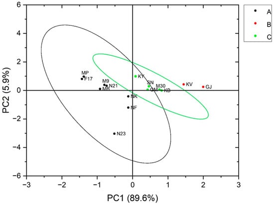 Biplot of the principal component analysis PC1 vs. PC2, describing the scores and variation in the crystallinity of the samples analyzed, showing scores represented by 95% confidence ellipses. MP—Mpologoma, MB—Mbiide, NK—Nakitembe, NF—Nfuuka, KB—Kibuzi, KY—Kayinja, KV—Kivuvu, GJ—Gonja, SN—Sukali Ndiizi, GM—Gros Michel, M30—NAROBAN5, M9—KABANA6H, N21—NARITA21, N23—NARITA23, F17—FHIA17. A—Samples display the A polymorph, B—samples display the B polymorph, and C—samples display a mixture of A and B, as described by the Pozo study [32].