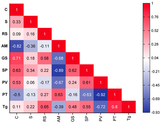Heat-map displaying the extent and direction of correlations (r) between RS compositional characteristics and physiochemical properties. Correlations were statistically significant at r ≥ 0.49 and r ≤ −0.49. C—clarity/%transmittance, RS—resistant starch content (g/100 g), AM—Amylose content (%), S—solubility at gelatinization (%), Tg—Gelatinization temperature (°C), GS—median granule size (µm), SP—swelling power (%), PV—peak viscosity (cP), PT—pasting time (min).