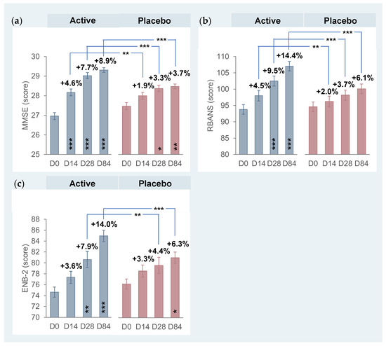 Cognitive function at baseline and after 84 days of product use. (a) Mini-Mental State Evaluation (MMSE). (b) Repeatable Battery for the Assessment of Neuropsychological Status (RBANS). (c) “Esame Neuropsicologico Breve 2” (ENB-2). Data are expressed as means ± SE. The intragroup statistical analysis is reported inside the bars while the intergroup statistical analysis is reported above the bars (blue lines). * p < 0.05, ** p < 0.01, *** p < 0.001.