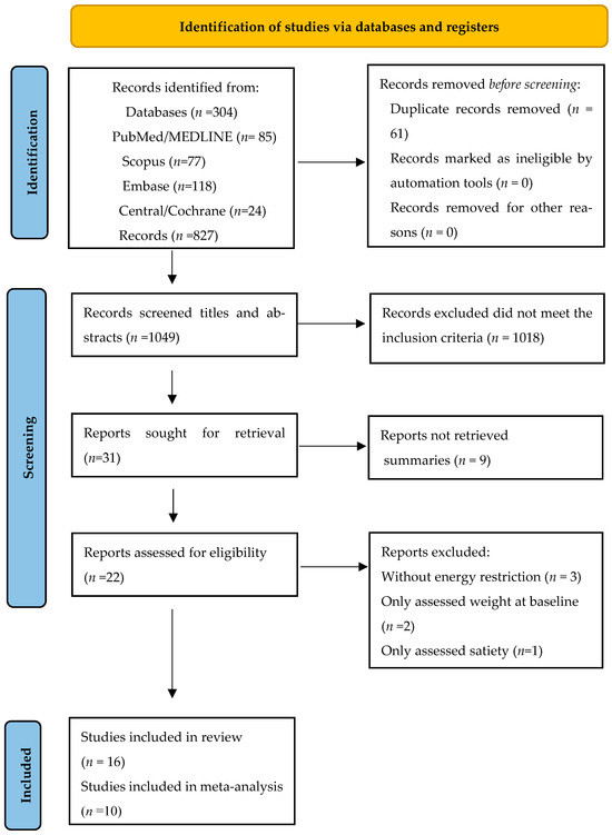 A total of 304 citations were retrieved from the PubMed/MEDLINE, Embase, Cochrane/Central, and Scopus databases from May 2024, and 827 from the reverse search. Of the citations retrieved from the databases, 223 titles remained after removing duplicates using Rayyan QCRY® software. During title and abstract screening, 192 records were removed based on the initial exclusion criteria. Of the 31 titles requested to be read in full, 9 were not retained because they were conference abstracts. In the reverse search of the 827 records screened, 1 remained for complete reading. Finally, 22 articles were read in full, of which 6 were excluded (Figure 1). The reasons for excluding studies were as follows: the intervention did not include energy restriction (n = 3), the study only assessed satiety (n = 1), and body weight was assessed only at baseline (n = 2). Details of excluded papers are available in the Supplementary Table S4. At the end of the process, 16 articles were included in this systematic review (Figure 1). However, meta-analysis was considered only for the studies with endpoint values of markers for the control and nuts groups. Thus, ten studies were included in the majority of the analysis of the meta-analysis. Some variables were not evaluated in some studies or were presented in graphic format. Thus, in some cases, the meta-analysis comprised fewer studies than the systematic review.