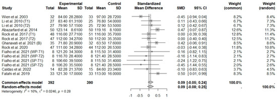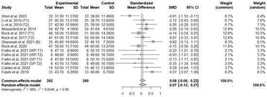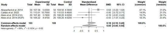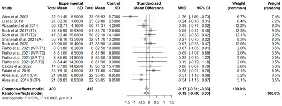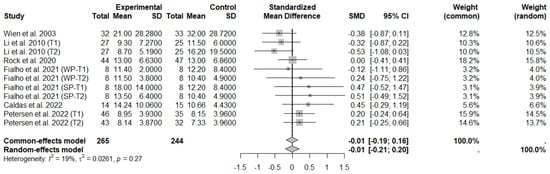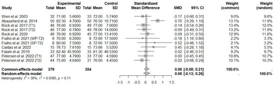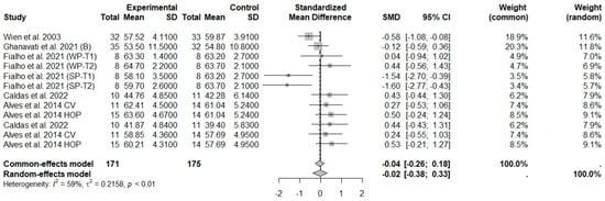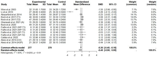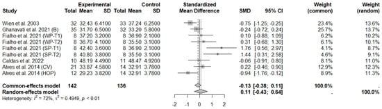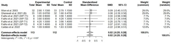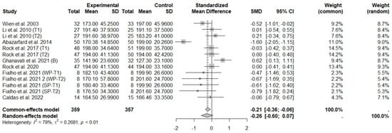 The consumption of nuts allied to an ER diet had no effects on body weight (SMD: −0.18; 95% CI: −0.40 to 0.03), BMI (SMD: −0.45; 95% CI: −0.90 to 0.00), WC (SMD: −0.04; 95% CI: −0.36 to 0.28), HC (SMD: 0.05; 95% CI: −0.45 to 0.54), FM (SMD: 0.11; 95% CI: −0.43 to 0.64), LM or FFM (SMD: −0.02; 95% CI: −0.38 to 0.33) compared to controls. Heterogeneity (I2) was equal to 51%, 83%, 76%, 69%, 72%, and 59% for body weight, BMI, WC, HP, FM, and LM, respectively, suggesting moderate to high heterogeneity between studies (Figure 2, Figure 3, Figure 4, Figure 5, Figure 6 and Figure 7). Almond intake decreased WC compared to controls (SMD: −0.93; 95% CI: −1.41 to −0.45) with moderate heterogeneity of evidence (I2 = 53%) (Supplementary Figure S6). In other subgroup analyses by nut type and time of intervention, eating nuts associated with an ER diet had no effects on anthropometric and body composition variables (Supplementary Figures S2–S11).