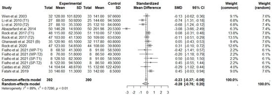 A meta-analysis of quantitative variables collected at the endpoint of the intervention period was performed to calculate the standard mean differences (SMDs) between treatment and control groups. Standard deviation was calculated for some studies with data of 95% confidence intervals and standard error. This way of meta-analyzing the data was chosen due to the lack of information about the mean difference (difference from the beginning to the end of the study) of the variables in most studies. To estimate effect sizes, the common-effects model and random-effects model were applied, and results were achieved based on the SMD and 95% confidence interval. The random-effects model was adopted considering the heterogeneity of interventions [33,34]. The I2 statistic was calculated to assess the heterogeneity (low: <50%; moderate to high: 50–75%; high: >75%). p Values < 0.05 were considered significant for all analyses [35]. Sensitivity analyses stratifying data by type of nuts and intervention time were performed. Due to the difficulty of obtaining information on the amount of energy restriction in some studies, the stratified analysis by the amount of energy restriction was not performed. The R software (meta package), version 4.3.3, was used for data synthesis.