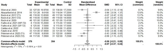 According to the main analysis, the intake of nuts allied to an ER diet had no effects on SBP (SMD: −0.07; 95% CI: −0.37 to 0.24) and DBP (SMD: 0.06; 95% CI: −0.13 to 0.26) compared to controls. This suggests low heterogeneity for DBP, and moderate heterogeneity between studies for SBP (Figure 16 and Figure 17).