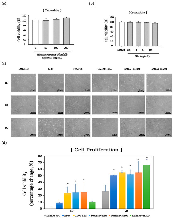The materials and reagents used in the study included H. pluvialis powder (Gaussdream, Gyeonggi, Republic of Korea), Trypsin-ethylenediaminetetraacetic acid (0.25% (Sigma-Aldrich, St. Louis, MI, USA)), OptiPRO serum-free-media (SFM (Thermo Fisher Scientific, Waltham, MA, USA)), Dulbecco Modified Eagle Medium (DMEM (Thermo Fisher Scientific)), Quanti-Max WST-8 Cell Viability Assay Kit (BIOMAX, Gyeonggi, Republic of Korea), Growth factor (GFs (EGF, FGF-2, and IGF-1/PeproTech, Cranbury, NJ, USA)). Other materials include insulin, transferrin, and selenium growth factor (ITS), PDGF-BB, and transforming growth factor beta 1 (Sigma Aldrich, St Louis, MO, USA). Unless noted, all chemicals were purchased from Sigma-Aldrich, St. Louis, MO, USA.