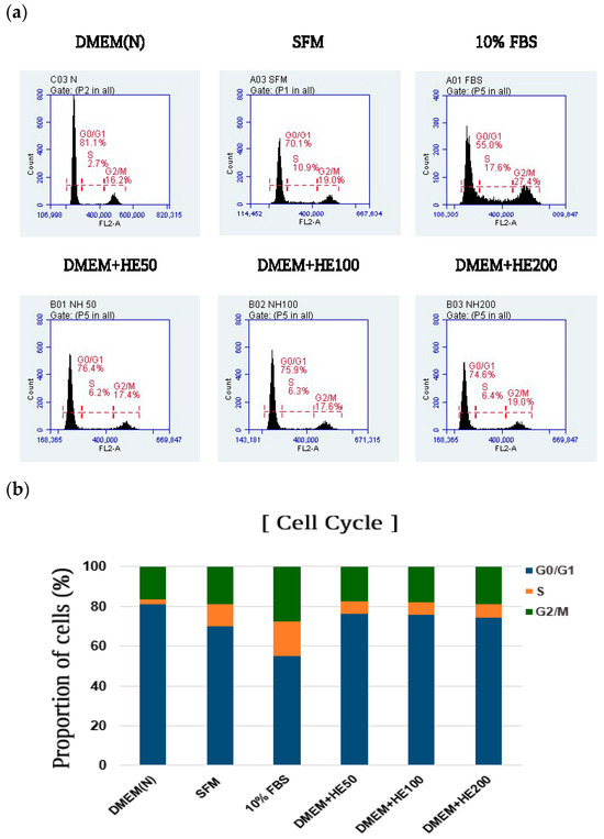 Moreover, cells treated with serum-free media supplemented with HE were analyzed using flow cytometry to investigate their effects on cell cycle progression. Cells cultured in DMEM without serum increased in the G0/G1 phase (81.1%) and decreased during the G2/M phase (16.2%) (Figure 2a,b). Contrastingly, the media containing 10% FBS decreased the proportion of cells in the G0/G1 phase (55.0%) and increased that in the G2/M phase (27.4%) compared with that of the DMEM group. Additionally, MRC-5 cells incubated in serum-free media with HE decreased and increased in the G0/G1 phase (74.6%) and G2/M phase (19.0%), respectively, in a dose-dependent manner compared with those in the DMEM group, indicating that supplementation with HE in serum-free media activated cell cycle progression, which was delayed in cells cultured in DMEM without 10% FBS.