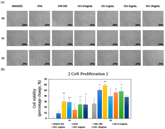 The results exhibited that GFs gradually increased cell proliferation without causing morphological changes at 24 h after treatment compared with the DMEM group (Figure 3a). However, cells treated with 10 ng/mL GFs did not exhibit proliferation after 48 h. Moreover, cell viability increased by 48.2% with the addition of up to 5 ng/mL GFs compared with that of the DMEM group (p < 0.05) at 48 h. Contrastingly, treatment with 10 ng/mL GFs reduced cell viability by 38.1% (Figure 3b) compared with 5 ng/mL GFs.