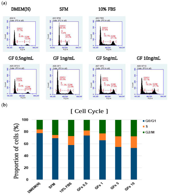 The cells were analyzed using PI staining and fluorescence-activated cell sorting (FACS) to examine the effects of GFs on the cell cycle. The proportion of cells in the G0/G1 phase increased to 77.7% in the DMEM (N) group compared with 57.8% in the 10% FBS group (Figure 4a,b). Conversely, the proportion of cells in the G2/M phase decreased in the serum-free medium group (15.9%) compared with that in the 10% FBS group (27.1%). Additionally, treatment with approximately 10 ng/mL GFs decreased and increased the proportion of cells in the G0/G1 and G2/M phases to 53.1% and 27.7%, respectively, indicating that GFs promote cell proliferation by activating cell cycle progression. Considering the decrease in cell proliferation at 10 ng/mL, a concentration of 5 ng/mL GFs was used for growth factor treatment in subsequent experiments.