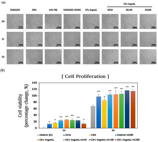 MRC-5 cells were treated with up to 200 μg/mL extract and 10 ng/mL of GFs to determine the optimal concentration of HE and GFs. Cell viability was analyzed using the WST-8 assay after 24 h. The extracts and GFs were not toxic to the treated cells (Figure 1a,b). Therefore, this study used concentrations of up to 200 μg/mL for the extracts (HE) and 10 ng/mL for the GFs. Next, to assess the proliferative effects of serum-free media supplemented with HE, cells were incubated in serum-free media with up to 200 μg/mL extracts, and cell morphology and cell viability were measured after 24 and 48 h. As described in Figure 1c, HE elevated cell density without altering cell morphology compared with the DMEM group. Additionally, the results revealed that the cell viability gradually increased in DMEM without FBS (DMEM (N), 26.6%) compared with that in the FBS group (FBS, 54.6%) after 48 h. However, SFM (SFM, 50.7%) and HE (HE200, 66.4%) significantly elevated cell viability compared with DMEM (p < 0.05) at 48 h.