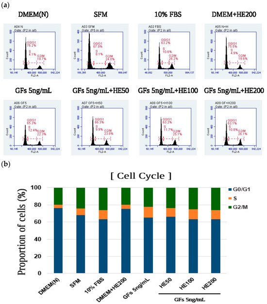 Moreover, the cells were analyzed to investigate cell cycle progression. GFs 5 ng/mL + HE200 reduced the proportion of cells in the G0/G1 phase by 63.1%, compared with those in the DMEM (N) (76.2%) group (Figure 6a,b). Additionally, GFs 5 ng/mL + HE200 increased the proportion of cells (26.1%) in the G2/M phase more than that observed in the DMEM (N) group (19.7%). The GFs and HE combination had a similar proportion of cells in the G0/G1 (63.2%) and G2/M (26.2%) phases compared with those of 10% FBS, demonstrating the synergistic effects of GFs and HE in stimulating cell cycle progression in the G0/G1 and G2/M phases.