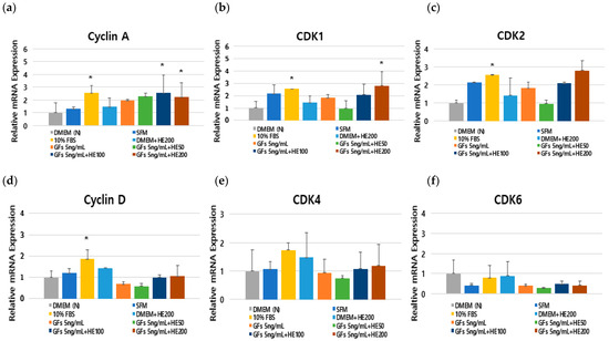 We analyzed the mRNA expression of cell cycle regulators (cyclin A and D, and Cdk1, 2, 4, and 6) to demonstrate how DMEM supplemented with GFs and HE activates cell cycle progression. Cell cycle regulators increased in cells incubated with medium containing 10% FBS compared with that containing serum-free medium (Figure 7). The GFs and HE combination significantly increased the mRNA levels of cyclin A and Cdk1 related to the G2/M phase, compared with that of the DMEM group (p < 0.05) (Figure 7a,c). Meanwhile, the expression of Cdk2 related to the S phase increased with treatment with a combination of GFs and HE. Additionally, the expression of Cyclin D, Cdk4, and Cdk6 genes, regulating the G0/G1 phase, increased with treatment with a combination of GFs and HE (Figure 7d,f), indicating that a mixture of GFs and HE activates cell cycle progression by enhancing cyclin A/Cdk1 expression, which is modulated during the G2/M phase.