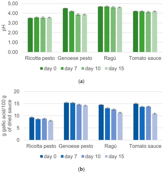 As reported in Figure 1a, Genoese pesto initially shows a pH of 4.51, consistent with the fact that this pesto is generally stabilized by pasteurization and acidified with acidity regulators at pH < 4.6 to inhibit microbial development [24]. The pH values of Genoese pesto decreased by 14.2% during the 15 days of storage, probably due to the increase in heptanoic and octanoic acid concentration. These compounds are produced by oxidation reactions that occur over time, and they are among the mainly responsible molecules for the rise of rancidity and acidity, according to studies present in the literature on the shelf life of Genoese pesto [24,25]. Tomato sauce presents a pH mean value of 4.21, in agreement with the ECC 1986 Regulation, which states that tomato sauce must have a pH < 4.5 [26]. Tomato–meat sauces (like ragù) belong to the low acid foods category (pH > 4.6), according to many studies that report an initial pH of tomato and pork sauce between 4.6 and 5.0 [27]. The analyzed ragù sauce presents pH values (4.68) in line with the literature. In Figure 1a, it is possible to observe slight fluctuations in the pH values of both ragù and tomato sauce, consistent with findings reported in the previous literature [23,27]. Similar studies concerning ricotta pesto are not available. The present results revealed that ricotta pesto, characterized by the lowest pH values, exhibited remarkable stability with minimal variability during the storage time (the changes were not statistically significant, Table S1). This behavior suggests that the low pH values contribute to the pesto’s resilience against bacterial attacks, as well as to a stabilizing effect against ingredient decay.